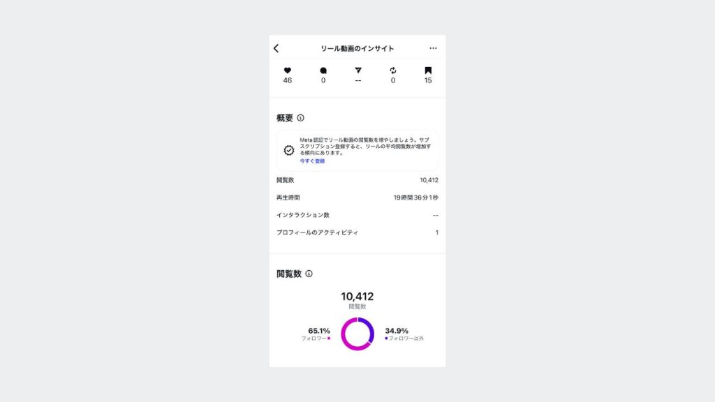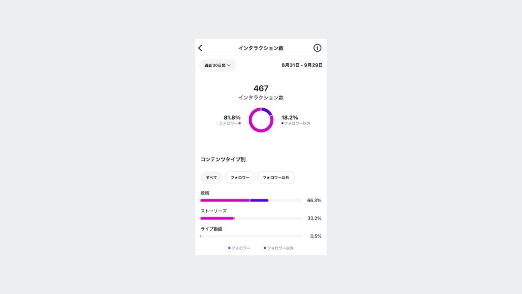 フィード・リール・ストーリーズ・ライブ配信などのコンテンツに対して、ユーザーが行った具体的な行動を指します。 - 閲覧数のユーザー属性の割合(フォロワー/フォロワー以外)