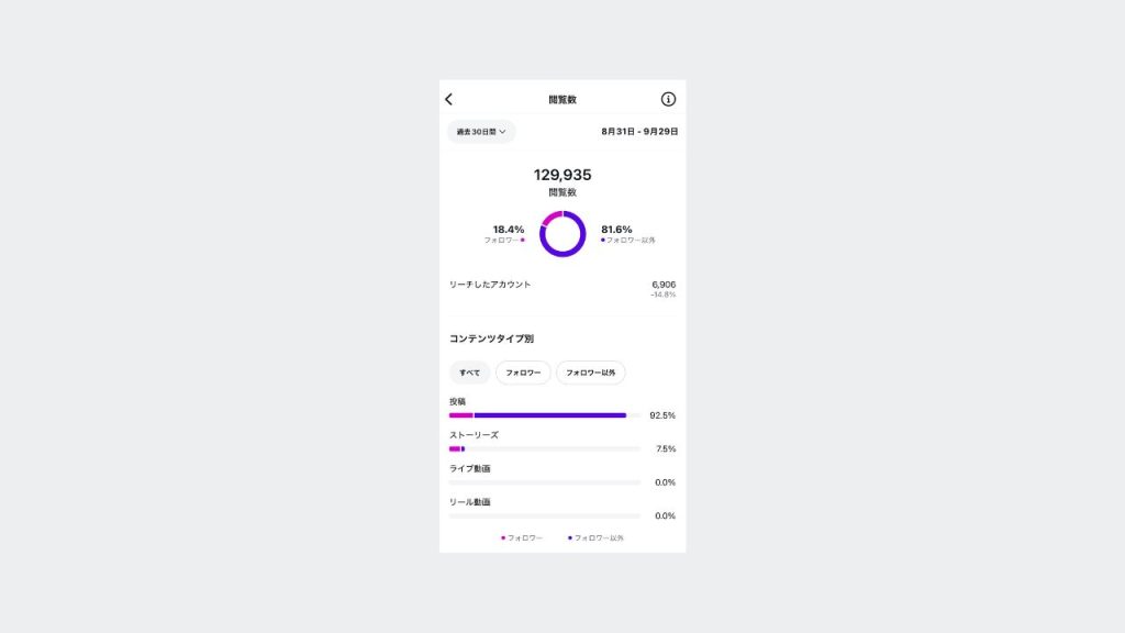 - 閲覧数のコンテンツの割合(投稿/ストーリーズ/ライブ動画)