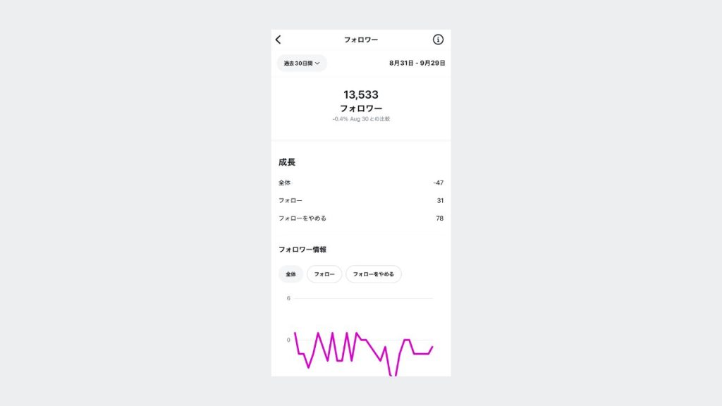 - フォロワー数の推移(全体の増減数、新規フォロー数、フォローをやめた数)