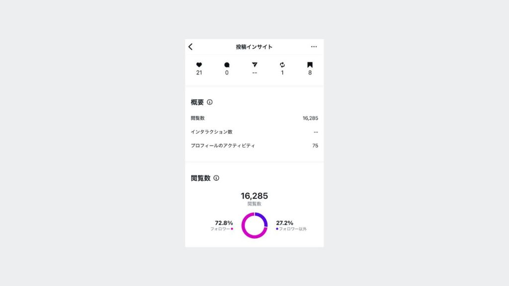 アカウント全体のインサイトだけでなく、1投稿ごとの数値も確認できます。