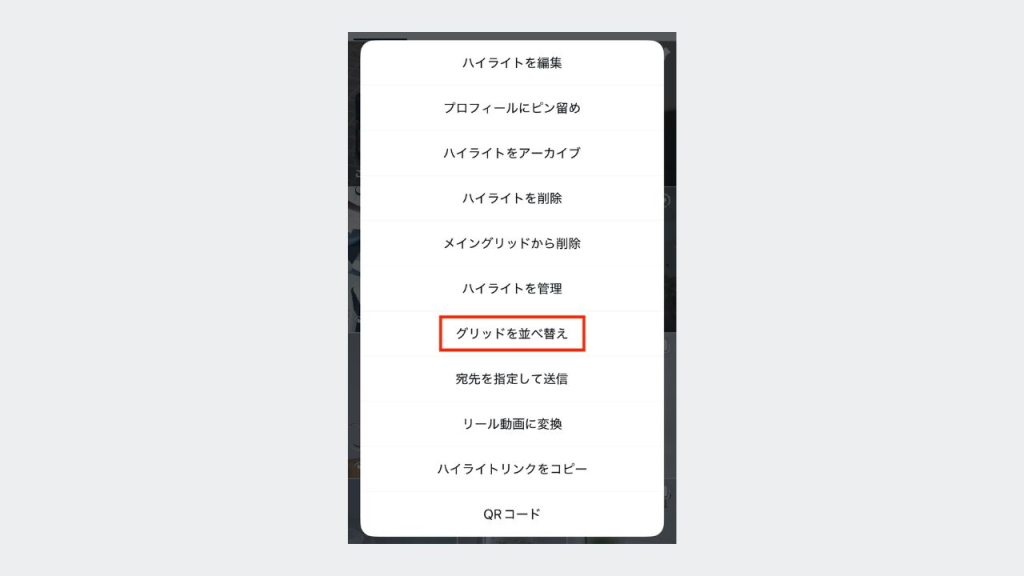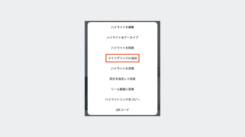 逆にハイライトタブのみに表示されているハイライトを長押しし、「メイングリッドに追加」をタップすると表示されます。