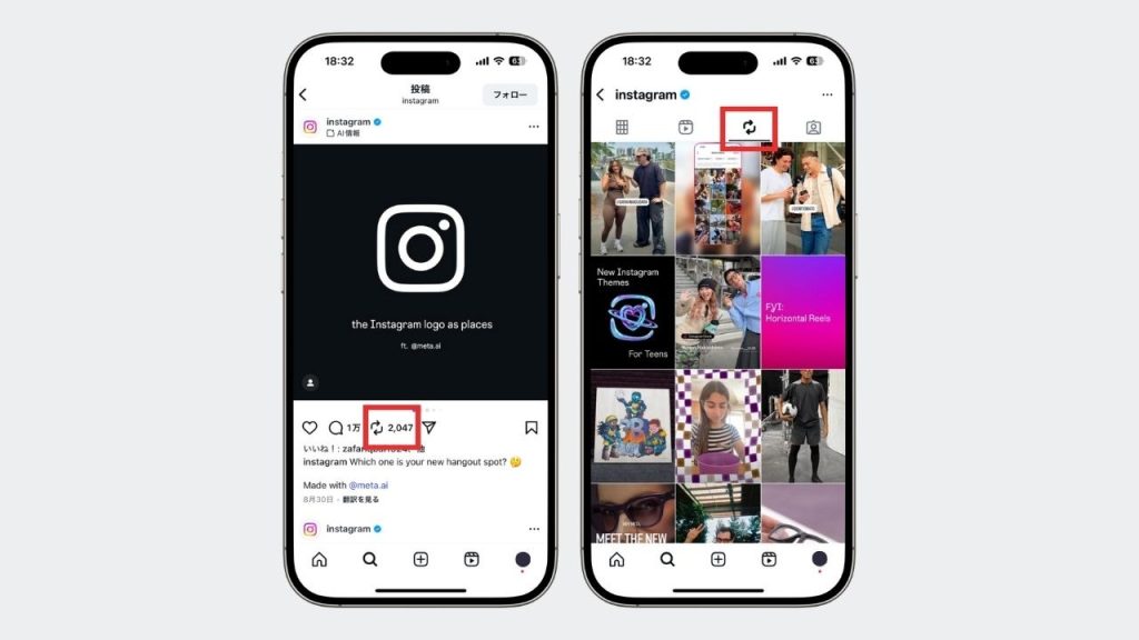 メイングリッド(通常投稿一覧)やリールタブとは独立しており、再投稿だけを集約できる仕様です。