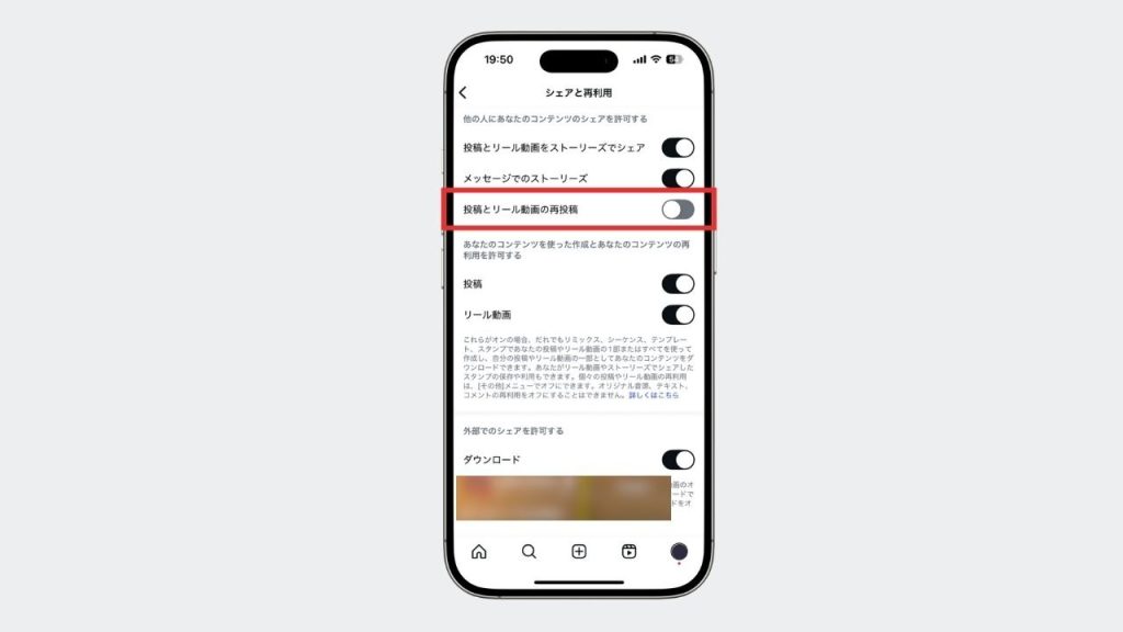 3.「他の人があなたの投稿を再投稿できるようにする」の「投稿とリール動画の再投稿」をオフにする