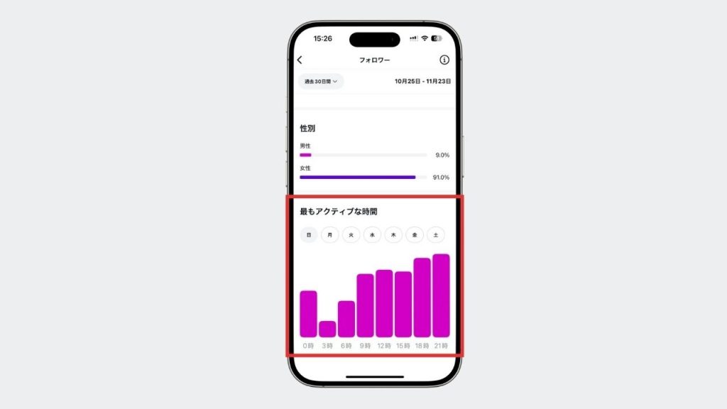 Instagramのインサイトでは、フォロワーの「最もアクティブな時間帯」を確認することができます。