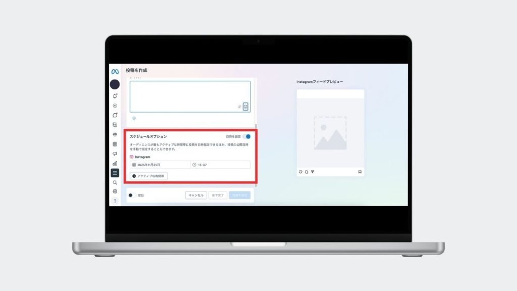 Instagramの予約投稿とは、即時投稿ではなく、「未来の日時」を指定して投稿を自動実行できる機能です。