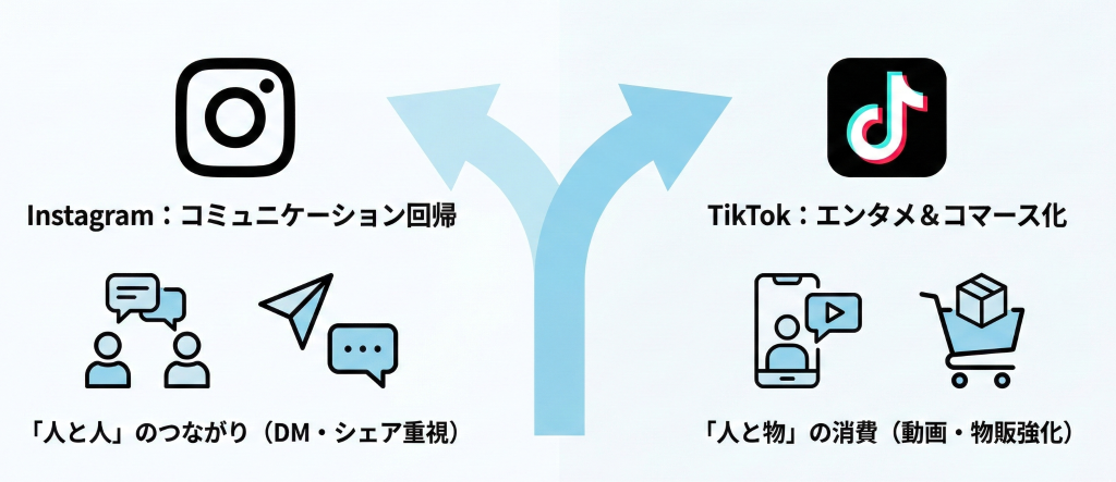 対するInstagramは、TikTokと同じ土俵で戦うのではなく、Instagram本来の強みである「人と人とのつながり(コミュニケーションツール)」としての価値に立ち返ろうとしています。