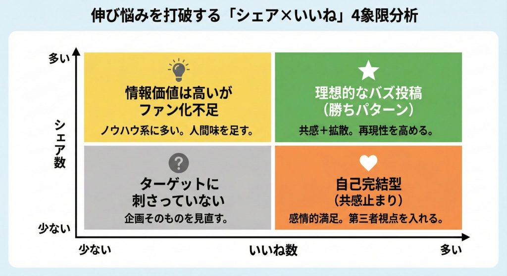 - 「いいね」と「シェア」のバランス分析で、勝ちパターンを見つける