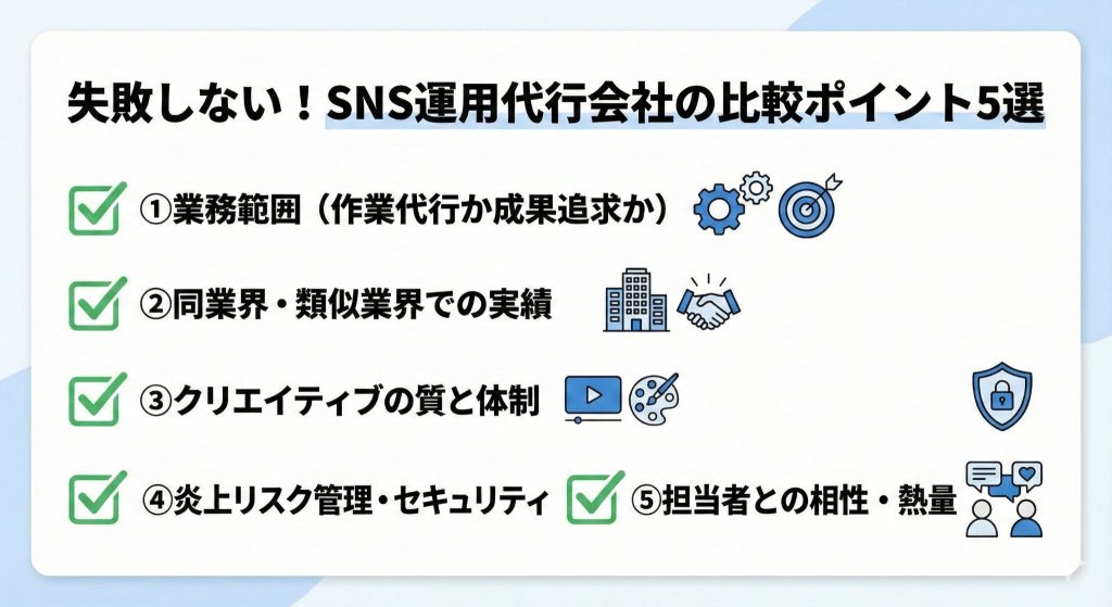 表面的な「費用の安さ」や「フォロワー数の増加実績」だけで判断するのではなく、本当に自社の利益に貢献してくれるパートナーを見極めるための「5つの比較基準」を公開します。
