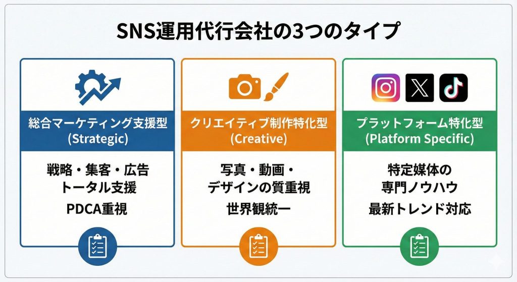 比較を始める前に、まずは「SNS運用代行会社」のタイプを理解しておくことが重要です。一言で「運用代行」と言っても、会社によって得意分野やスタンスは大きく異なります。
