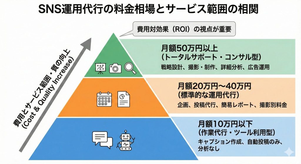 SNS運用代行の費用は、月額数万円〜数百万円まで非常に幅が広く、「相場が見えにくい」のが実情です。