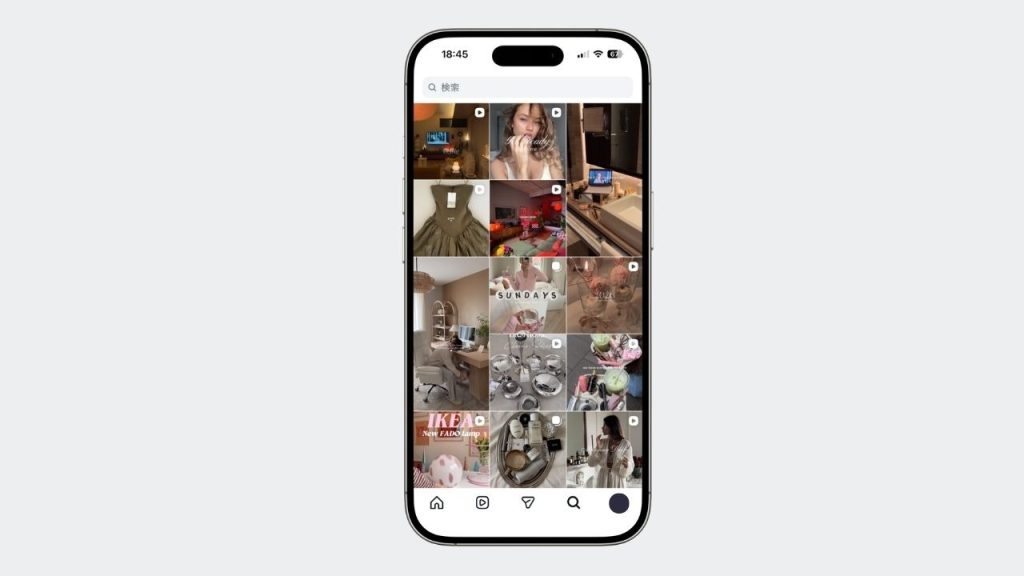 アプリ下部の「虫眼鏡アイコン」をタップした先に広がる、タイル状に投稿が並ぶ画面です。
