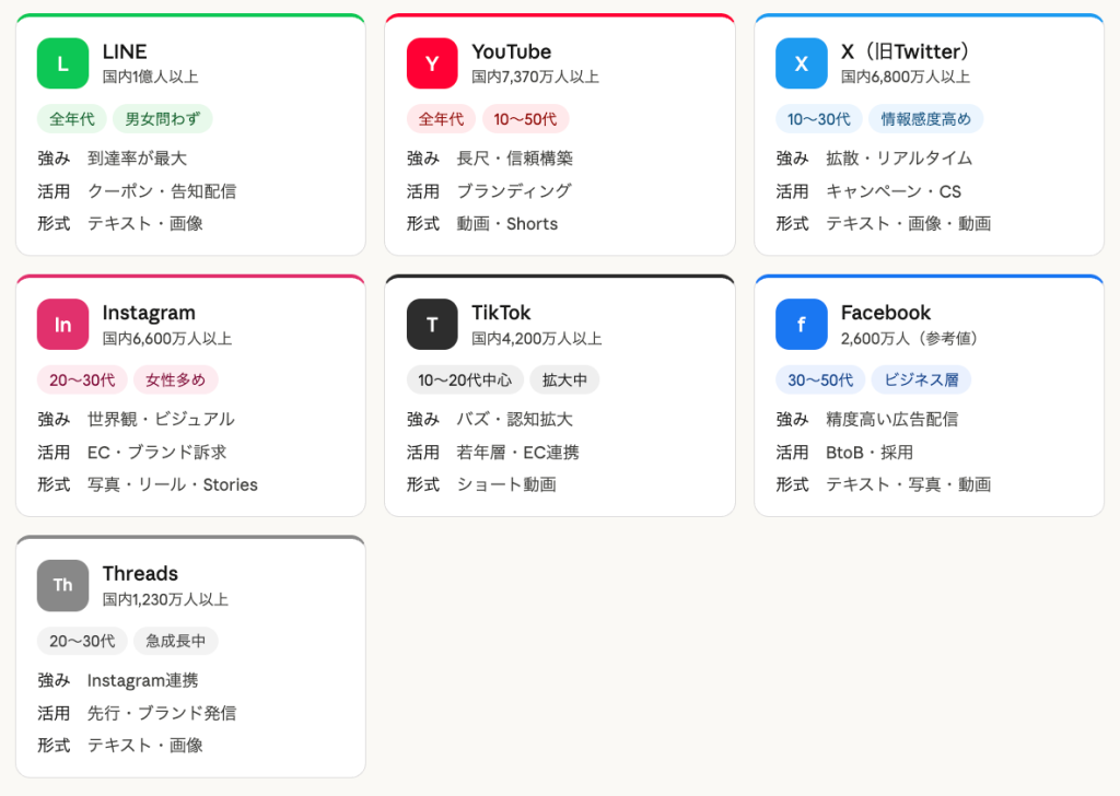 ・Facebook:2,600万人。30〜50代のビジネス層向け。Meta広告との連携が強力